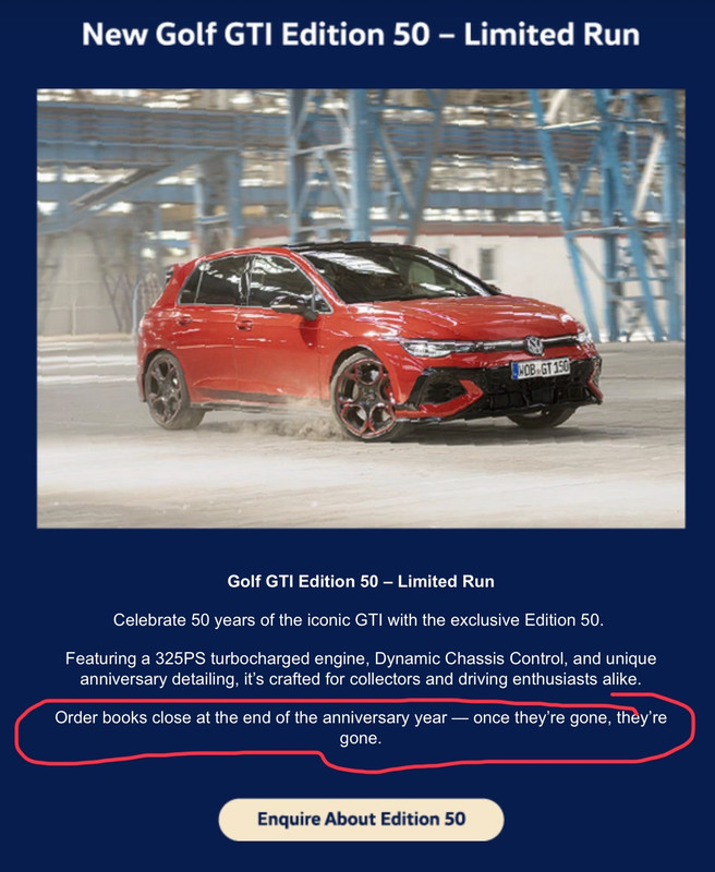 I received a newsletter from the local VW dealer today that included the undernoted - states that order books close at the end of the anniversary year. I’m assuming ‘anniversary year’ = 2026 calendar year and if so, then it should be possible to order a GTI ED50 up to and including 31/12/2026. On that basis;