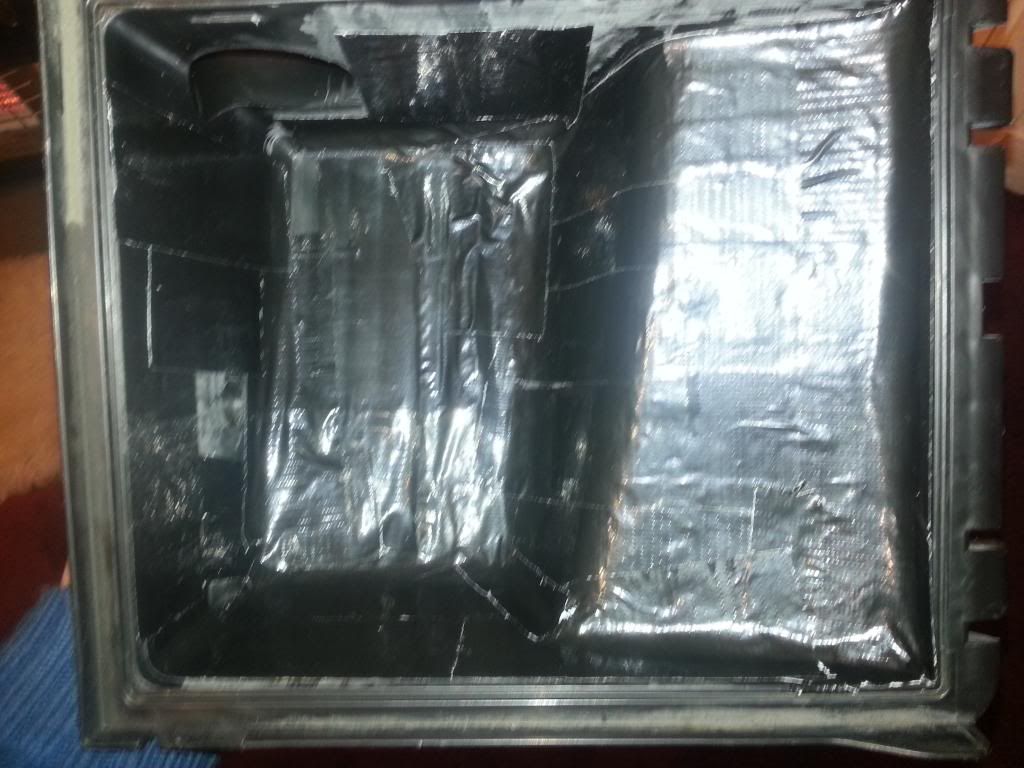 Not silver tape, but I did as Ess_three about lining it with heat reflective gold foil, to give it an extra layer of heat protection, but he said the plastic is a good enough insulator so there's no need for the foil. Reason I got rid of fins is to create smoother airflow upwards into the filter + more room inside (only by a bit, but the amount of plastic I removed was surprising!)  :smiley: