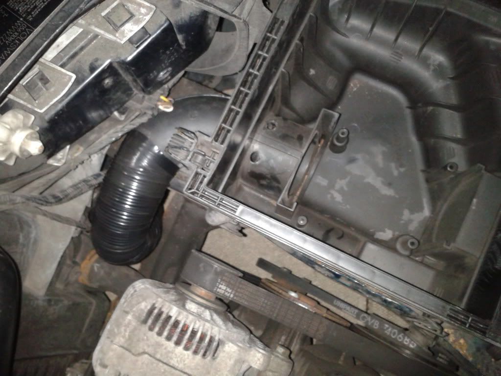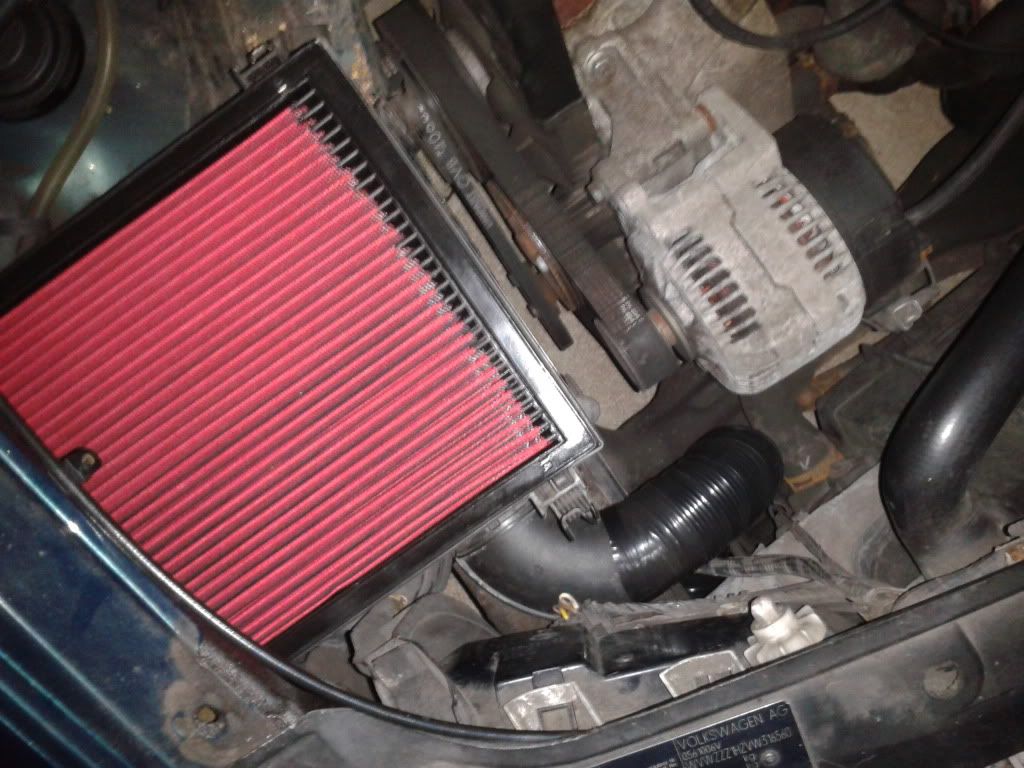 Fitted a K&N yesturday and mod'ed the air box. I removed the 90 degree bend on the box and cut the narrow trumpet out and trimmed the other end down to make the inlet about 2", then refitted it the wrong way round, with a lenth of alloy air ducting that catches air coming into the driverside bumper vent. Heres a few pics.
